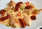 AIGUILLETTES DE POULET, SAUCE CRÉMEUSE AU CHORIZO
