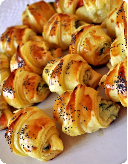 Mouillez avec un peu d’eau le centre pour que ça se ferme bien. Roulez les parts en partant du bout externe pour une forme de croissant, et déposez-les sur une plaque recouverte de papier sulfurisé.