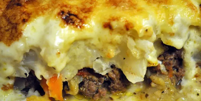 Le principe est celui du hachis parmentier (une couche de viande, une couche de légumes) mais à la place de la purée de pommes de terre, je mets du chou-fleur. Une sauce béchamel (presque) allégée nappe le tout.