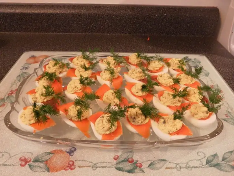 Les œufs farcis au saumon fumé font de délicieuses bouchées. Le goût du saumon et de l’aneth s’agence exceptionnellement bien à la texture crémeuse des jaunes d’œufs.