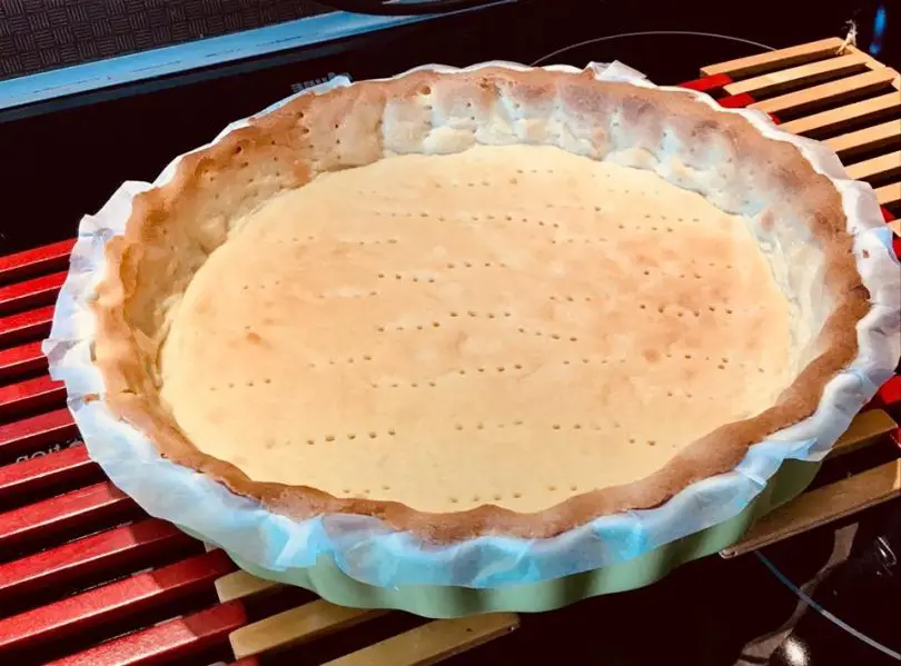 Farinez le plan de travail puis étalez la pâte et foncez un moule à tarte. Garnissez le fond de pâte avec les ingrédients de votre choix.