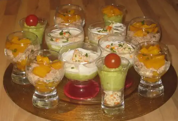 Verrine crabe-avocat. Mixer l’avocat, le saler et le poivrer et rajouter du jus de citron. Mixer les bâtonnets de surimi si vous n’avez pas de surimi râpé. Pour dresser, mettre un peu de surimi dans le fond du verre puis mettre une couche d’avocat et enfin décorer avec une tomate cerise.