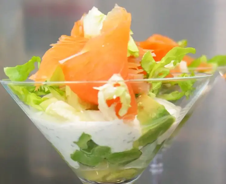 Rehausser le tout d’une tranche de saumon fumé coupée en 3, et harmonieusement disposée comme des pétales de fleur.